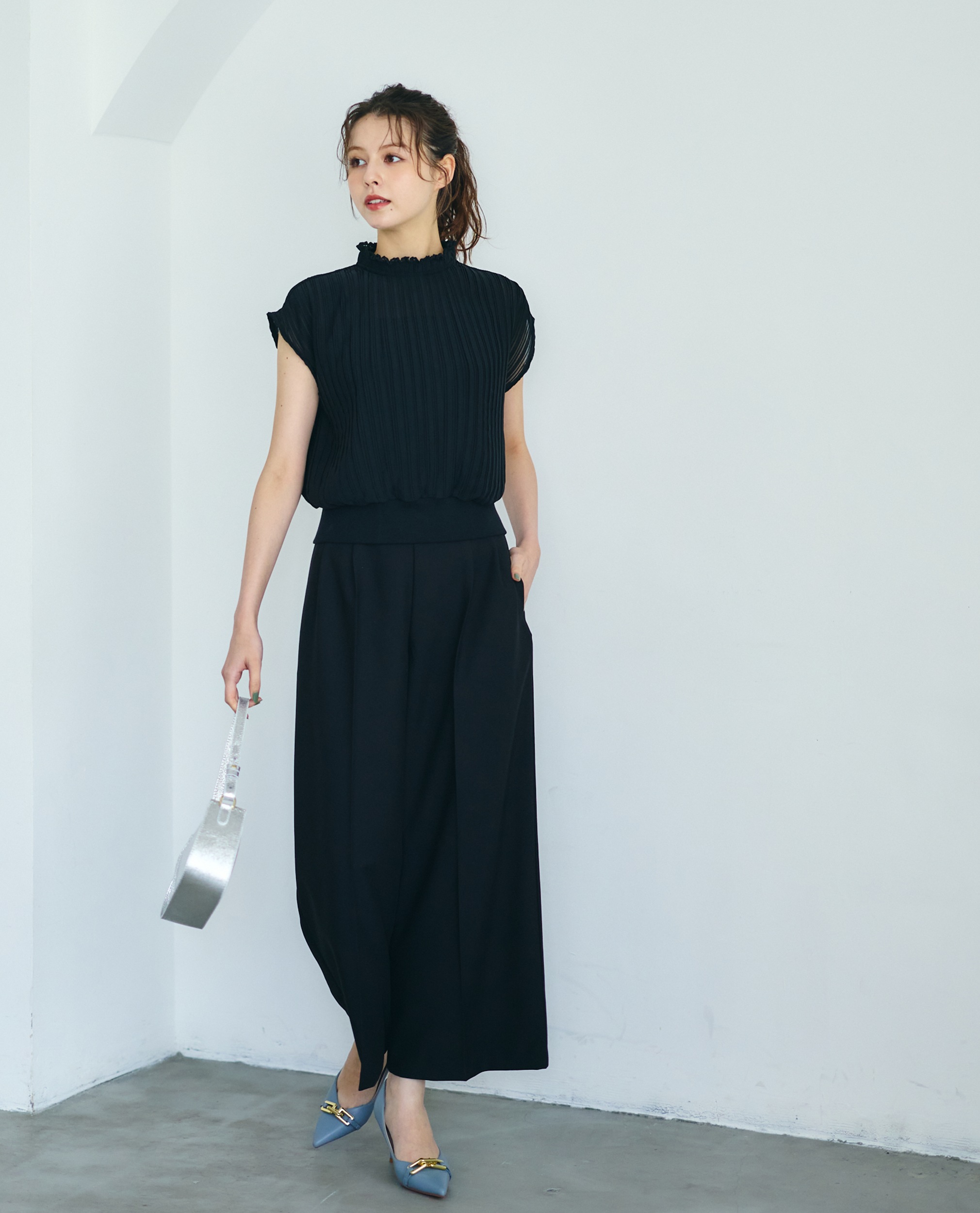 透け感のあるシアープリーツと、マットな質感のクロスパンツ。