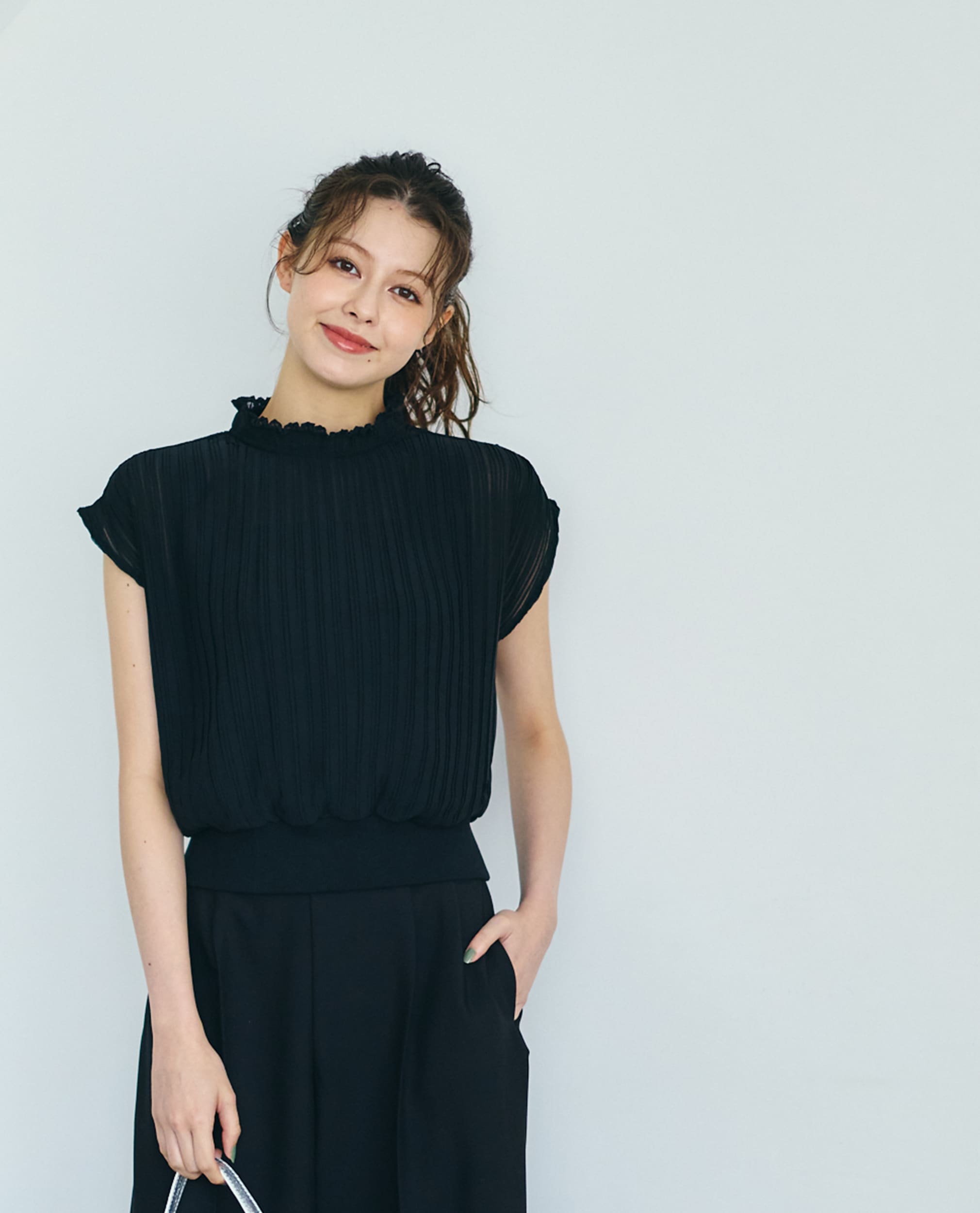 控えめなフリルと、繊細な透け感が品よく映える黒のワントーンスタイル。