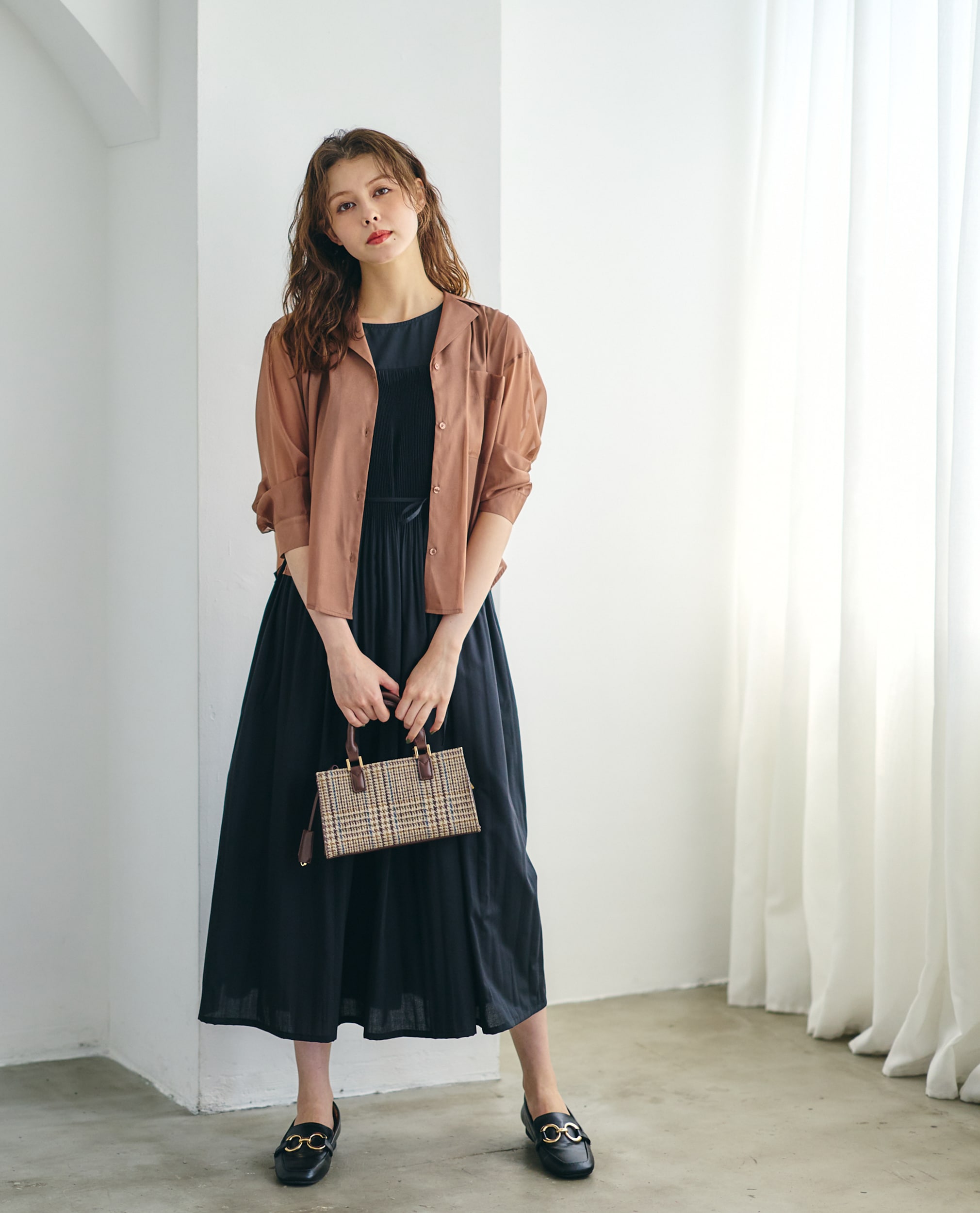 軽やかなシアー素材を合わせ、ブラックとブラウンの絶妙なグラデーションを演出。
