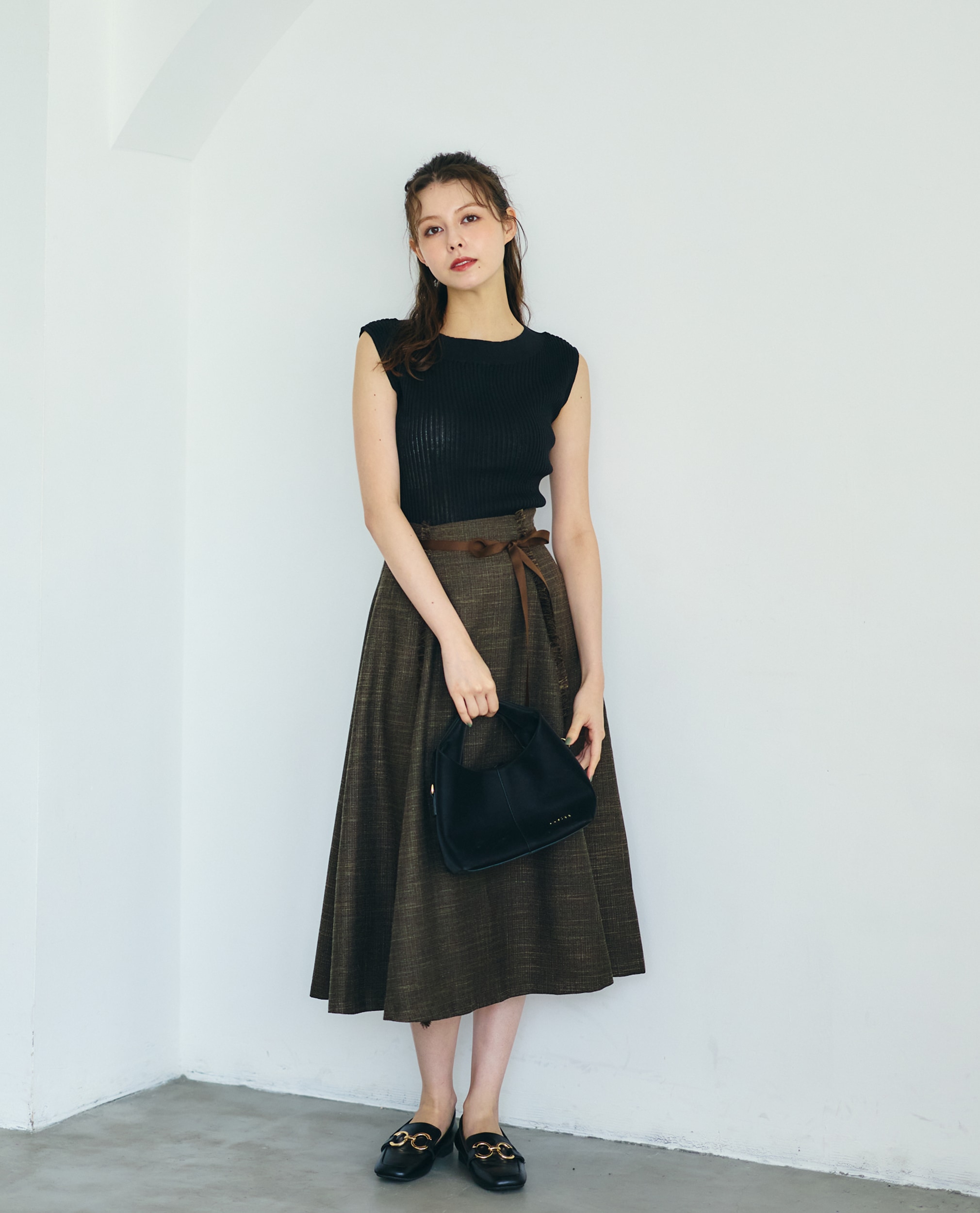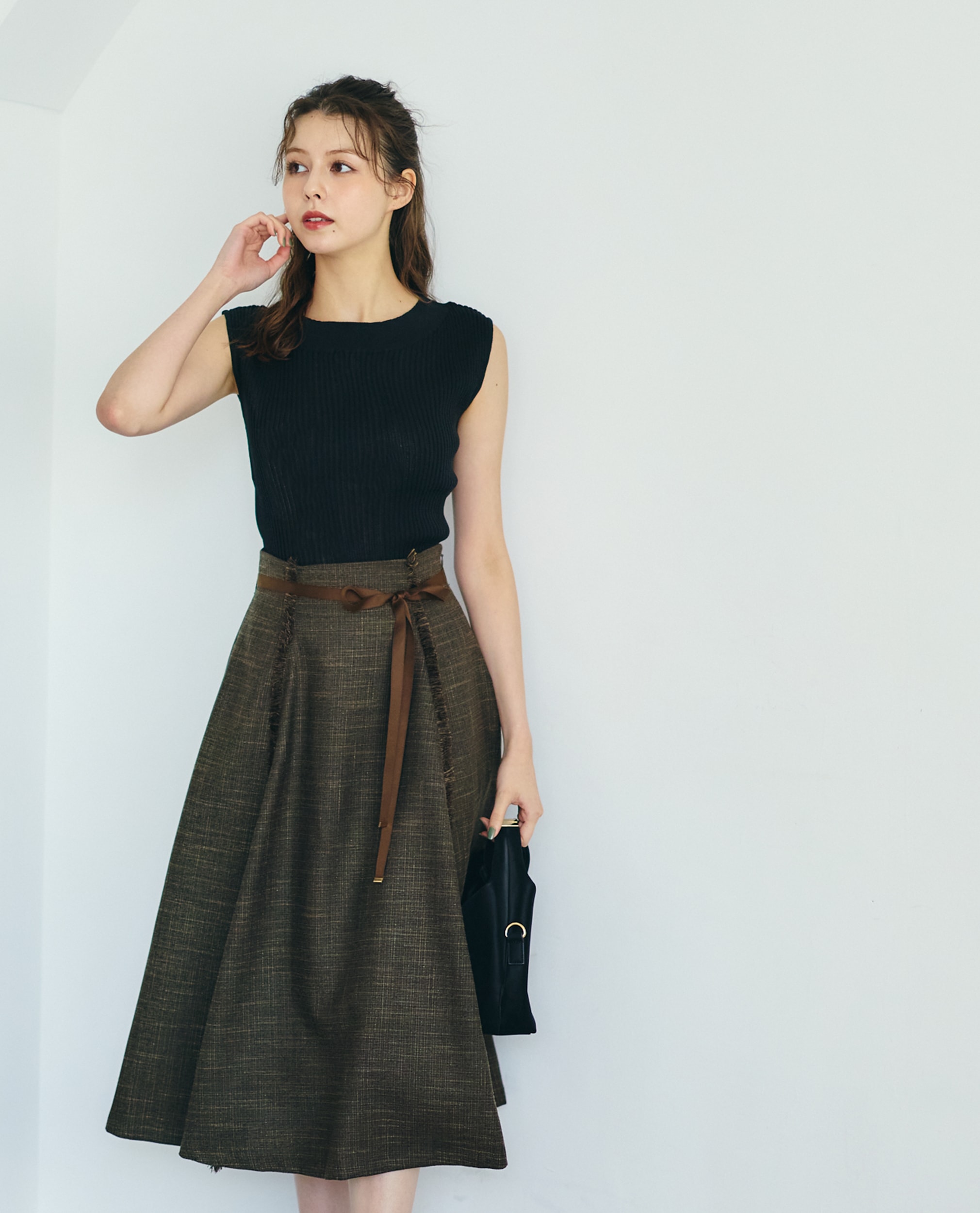 ライトツイードのフレアスカートにあしらわれたリボンが女性らしいアクセントに。